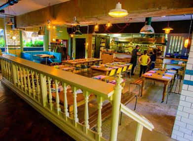 - The radiant space features colourful, private snug booths and a raised stage area.