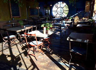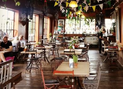 The café is situated on the first floor of a harbour side warehouse-style building, the ground floor being an award-winning bike shop. With its industrial chic decor, the café enjoys stunning views over Bristols floating harbour and with its convenient central location it is has become a very popular venue for parties for two up to a hundred and two.