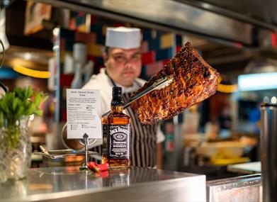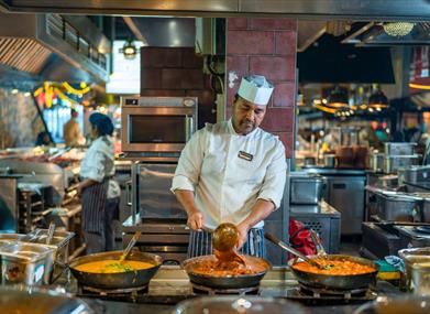 Dine at Za Za Bazaar and enjoy a culinary adventure that will awaken all senses. With foods from across the world, including vegan and vegetarian options, served in a vibrant street food market atmosphere. Watch in amazement as specialist chefs live cook your favourite dishes from fresh ingredients and enjoy a wide variety of expertly created cocktails, sip wines of the world chosen by Za Za’s sommelier, and enjoy a variety of beers, ciders and spirits as well as delicious mocktails and non alcoholic options. As one of the UK’s largest restaurants and such a large variety of dishes available, Za Za Bazaar is perfect for groups of almost any size.