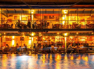 The Lido is a uniquely Bristolian experience: a 21st century take on a Victorian institution. This architecturally ambitious building, reflecting Egyptian design influences, served as a community leisure facility for more than 100 years before falling into disrepair and being closed in 1990. The restaurant sits in the old viewing gallery, with a wonderful vista of the pool, which is dramatically lit at night.